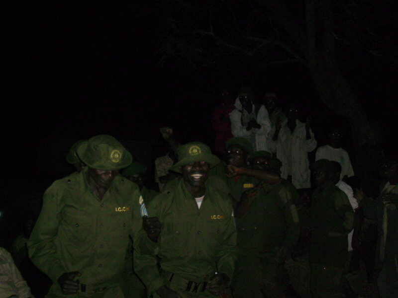 De waterval van Dikolongo is eigenlijk een soort cascade van verschillende waterpartijen die trapsgewijs van het ene plateau op het andere neerstromen. In Kawa dendert het water echter weer als één kolkende massa naar beneden. Uiteindelijk moeten we het natuurspektakel laten voor wat het is en stilletjes aan naar Kayo afzakken. Het wordt nog een pittige rit. De lamentabele wegen zorgen ervoor dat het allemaal weer veel langer duurt dan aanvankelijk gedacht. Een afstand in kilometers uitgedrukt is in het Congo van vandaag immers een zinloos begrip. Alles hangt af van de toestand van de weg en die is in de beste gevallen slecht en in heel wat gevallen gewoon rampzalig. Daarnaast is er ook de mogelijkheid van onverwachte blokkades door enkele individuen die geld eisen in ruil voor een vrije doorgang. Normaal moeten we Kayo, de toegangspoort naar het Upemba park, bereiken rond 18h maar het is al ruim 21h wanneer we aankomen. We worden er opgewacht door een groep parkwachters die vannacht en morgen zullen instaan voor onze veiligheid. Gedurende de gewapende conflicten van de laatste jaren zijn er immers Mai Mai-milities die hun toevlucht in het Upemba park hebben gezocht en je weet maar nooit hoe een toevallige ontmoeting zou kunnen uitpakken. Ook wildstropers zijn hier actief en vormen eveneens een gezelschap waar we liever niet mee geconfronteerd worden. Na een uitgebreide begroeting worden de voorzieningen voor het nachtkamp getroffen. Terwijl wij de omgeving verkennen en een babbeltje slaan met de intussen toegesnelde bevolking zetten de parkwachters 2 grote tenten op waarin we, genesteld in onze warme slaapzak, straks de nacht zullen doorbrengen. De tenten en de slaapzak zijn geen overbodige luxe want het kan hier 's nachts heel fris worden en zelfs een enkele keer vriezen. Er staat in de wijde omgeving maar 1 stenen gebouw en dat is de vroegere woning van de hoofdopzichter. Het huis is echter een complete ruïne , bovendien onbeschrijfelijk smerig en zit vol ongedierte. Onze hele bende schuifelt bijeen in een van de kleine ruimtes. Het is er pikdonker en we moeten zelf licht maken met onze zaklampen. Elektriciteit, in welke vorm dan ook, is hier immers niet voorhanden. Terwijl de parkwachters buiten in het licht van de koplampen van de jeeps de tenten aan het opzetten zijn, heeft hun chef voor iets te eten gezorgd. We zullen het moeten doen met het “aanbod van de dag” en dat is duidelijk geen haute cuisine: wat zwartgeblakerd vlees en een homp fufu vormen het zowel in kwaliteit als kwantiteit beperkte menu. We rammelen echter allen van de honger en aanvaarden hoffelijk het weinige dat deze mensen ons kunnen bieden. Gelukkig is er in Congo wel altijd en overal bier voorradig zodat we de maaltijd kunnen doorspoelen met een flinke slok Simba. Wanneer we even later ons naar het tentenkamp begeven is er ook al een groot kampvuur aangelegd. De parkwachters hebben blijkbaar zin in een feestje. De vlammen worden stevig opgepookt, de drank vloeit en binnen de kortste keren toert de hele bende al zingend en dansend rond het vuur. Boven ons schittert de Congolese sterrenhemel. De temperatuur is ondertussen stevig gekelderd maar de warme gloed van het kampvuur geeft een aangenaam gevoel. De vrolijke bedoening gaat nog uren door en het is dan ook ruim na middernacht als de laatste in zijn slaapzak kruipt voor wat een korte nacht zal worden.