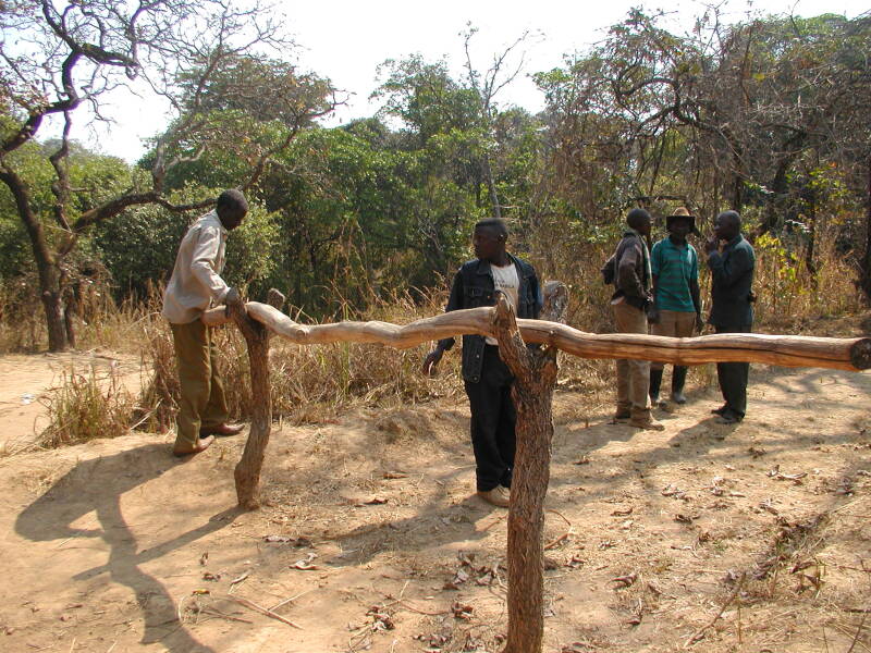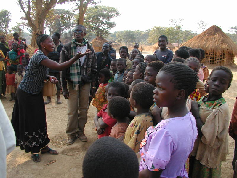 Blijkbaar gaat het hier om een belangrijke taak want, alhoewel we niets van het taaltje begrijpen krijgen we toch de uitgesproken indruk dat er een lichte twist onder de notabelen ontstaat over aan wie de eer te beurt zal vallen. Gelukkig is er iemand bij die schijnbaar toch wat meer gezag kan doen gelden en de knoop doorhakt zodat we ons op weg kunnen begeven. We volgen de gidsen door een stukje van de brousse die het dorp helemaal omsluit. Plots worden we aangemaand halt te houden. Het hoofd van onze delegatie gaat op zijn eentje een eindje verder het struikgewas in om wat verderop de eventueel aanwezige boze geesten te bezweren en de gunsten van de goede geesten te aanroepen. Eenmaal het ritueel beëindigd wenkt hij ons nader en dan kunnen we doorstappen tot aan een kleine, heldere waterpoel die geleidelijk overgaat in een klein beekje. We worden verzocht om elk een één dollarbiljet in de poel te werpen en vervolgens een klein slokje van het water te nemen. Ik bedank echter feestelijk voor deze eer en verdwijn discreet in de achtergrond terwijl de rest hun geld in het water gooit en de een al meer dan de andere gebaart dat hij van de bron drinkt. Daarna volgt een soort symbolische collectieve oversteek van het beekje wat een korte evenwichtsoefening vereist want de oversteek gebeurt langs een dwarsliggende boomstam. Na afloop van deze plechtigheid keren we terug naar het dorp terwijl onze achtergebleven delegatieleiders ongetwijfeld al druk doende zullen zijn om de bankbiljetten uit het water te vissen. Als we terug in het dorp aankomen en nog eens aan het dispensarium voorbij lopen, vernemen we dat de vorige dag een vrouw is bevallen van een tweeling. Aangezien het hier mangelt aan babyvoeding laten we wat geld achter om in het nodige te kunnen voorzien. Zo wordt het stilaan tijd om de terugweg aan te vatten want het is ondertussen al 15h. We leggen nog een groot deel van de afstand af in het donker. Links en rechts van ons brandt de savanne en op sommige plaatsen loopt er zelfs een vuurspoor over het pad dat we volgen. Het gaat hier wellicht grotendeels om aangestoken branden met het oog op het vrijmaken van nieuwe cultiveerbare stukken grond. Het spektakel geeft de rit wel een bijzondere sfeer en zo komen we goed geluimd rond 20h terug aan in Likasi.