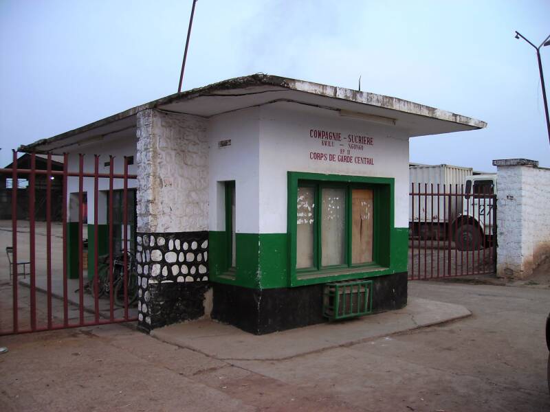 Als het aan Jacques ligt zal er zeker niet nodeloos worden gedraald. Hij stuurt de jeep de aardeweg op en binnen de kortste keren razen we er vandoor met een enorme stofwolk in ons spoor. Een tiental kilometer is de weg nog aardig vlak en is het vooral een stoffige bedoening. Dit stuk leidt nog door een soort half - savanne met een toch wel dicht maar laag struikgewas als begroeiing langs weerszijden van de zandpiste. Voor de rest van de weg rijden we echter nog slechts omgeven door onmetelijke suikerrietvelden. Het is net alsof je middenin een doolhof aan het rijden bent. Wat erger is: de staat van de piste verbetert er niet op. Het is weer hobbelen geblazen. Even denk ik dat ik terug in Katanga ben verzeild geraakt, op weg naar Mokabe Kasari. Maar ten slotte blijft het hier op deze piste best nog wel meevallen. Af en toe komt er vanuit de andere richting een vrachtwagen met in de laadbak een groepje werkvolk dat van het veld, of misschien wel de fabriek, terugkeert. Het begint al aardig laat in de namiddag te worden. Alvorens we de fabriek in zicht krijgen passeren we eerst nog door een tweetal kleine woonkernen met oude koloniale huizen waar we trouwens nog eens informeren want op deze plaatsen zijn er telkens ronde pleintjes waar verschillende weggetjes op uitkomen. Als het toch wel enorme fabriekscomplex eindelijk opdaagt loopt het al tegen 17h30.