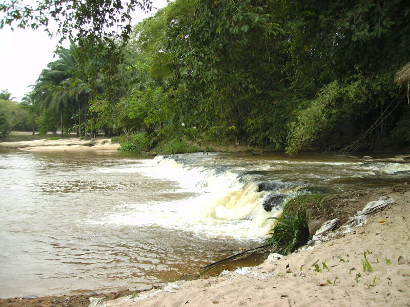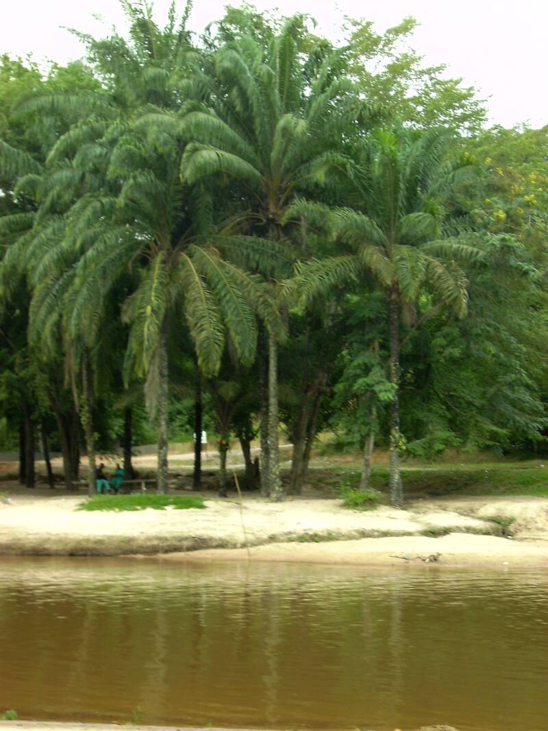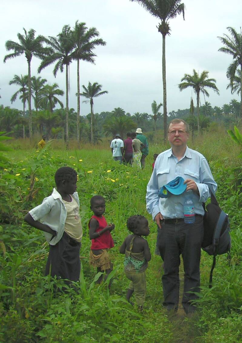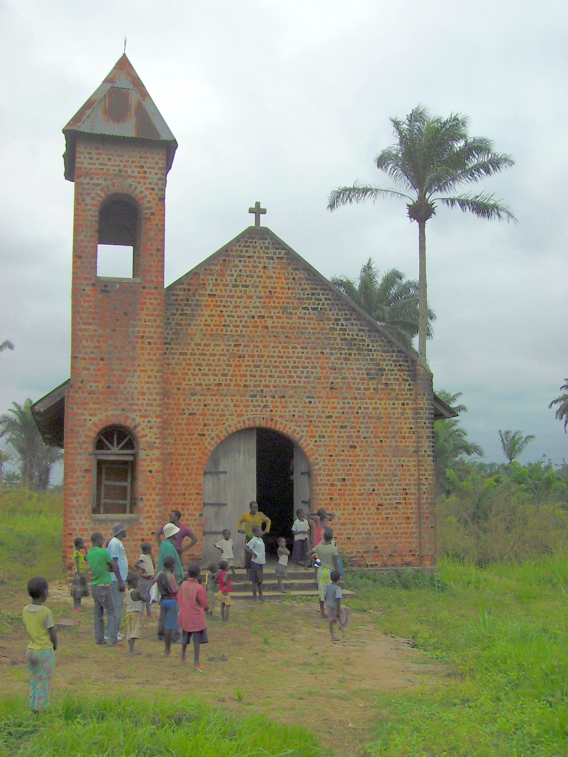 Bij het binnenrijden van het dorpje komen we eerst voorbij een schooltje dat nog maar pas lijkt opgeknapt maar dan verbleekt het plaatje zienderogen. Het hele dorp bestaat uit de bouwvallige resten van de woningen die nu al meer dan 60 jaar geleden door de Compagnie Jules Van Lancker voor de plantage-arbeiders werden gebouwd. Al wat nu nog rest van de huisjes is de in grijze betonsteen opgetrokken maar ondertussen steeds verder afbrokkelende ruwbouw. Toch zijn ze nog allemaal bewoond. Onze aankomst brengt de hele gemeenschap in beroering. Een jonge vrouw die zichzelf al direct tot hoofd van het welkomstcommité profileert, neemt resoluut de leiding van het “geleide bezoek” dat ons hier te beurt valt. Zij blijkt een goede gids want ze voert ons via een shortcut en dwars door enig broussegewas tot aan de kerk van het gehucht. Het gebouw zelf heeft de last der jaren nog redelijk goed doorstaan maar het interieur is een complete ruïne. Toch is de kerk nog altijd in gebruik en wordt buiten de diensturen ter bescherming van eventuele verdere “pilage” de poort angstvallig op slot gehouden. De mensen die hier nu wonen zijn veel te jong om de hoogdagen van de Cie Jules Van Lancker te hebben meegemaakt maar toch lijken zij mij bewust van het verleden van hun nederzetting. Uit de enkele gesprekken die we kunnen voeren valt immers duidelijk op te maken dat ze toch wel enig notie hebben van wat hier vroeger bestond en beseffen dat zij eigenlijk leven op de ruïne van wat eens een kleine, bloeiende gemeenschap was. Naast de ruïnes van enkele pakhuizen en de kleine villa waar de vroegere technicus van het bedrijf woonde, tonen zij op de rondgang ook de resten van een pompinstallatie die er ooit voor zorgde dat er vanuit het wat lager gelegen riviertje, de Tombo, water kon worden opgepompt. Iets verderop staat er ook nog een totaal overwoekerde watertank die nog net met zijn rand boven de wildernis uitkomt. We willen ook graag het huis, of wat er van rest, van onze vriend Gerard Capelle bezoeken. Wanneer we hierover verdere inlichtingen vragen krijgen we echter te horen dat het gebouw volledig is gesloopt (“door de mens of de natuur”?, vraag ik mij stilletjes af) maar dat het toch nog mogelijk is om de bewuste site te aan te tonen. Daarvoor moeten we ons dan wel eerst een eindje buiten het dorp begeven. We houden halt nabij enkele lemen hutjes naast de zandpiste en inderdaad, iets verder kan je nog de contouren zien van wat eens een gebouw is geweest. Je kan het merken omdat er zich temidden het groen een iets hoger gelegen, in een soort van een vierkante vorm gegroeide, mini-jungle aftekent met hier en daar nog een zichtbaar stuk beton. Prompt haalt één van onze begeleiders de machete boven en begint op de wildgroei in te hakken. Hij wil ons persé bewijzen dat hij ons de juiste plaats heeft aangewezen. Zijn vrienden bezweren hem echter ,en ook ons, om hiermee omniddellijk te stoppen want deze plaats schijnt bekend te staan als een geliefd schuiloord voor slangen. Aangezien ik niet erg gesteld ben op het risisco van een slangenbeet geloof ik de man graag op zijn woord zodat de ijvverige “tuinier” zijn inspanning kan staken.